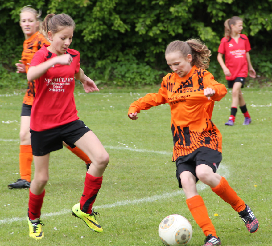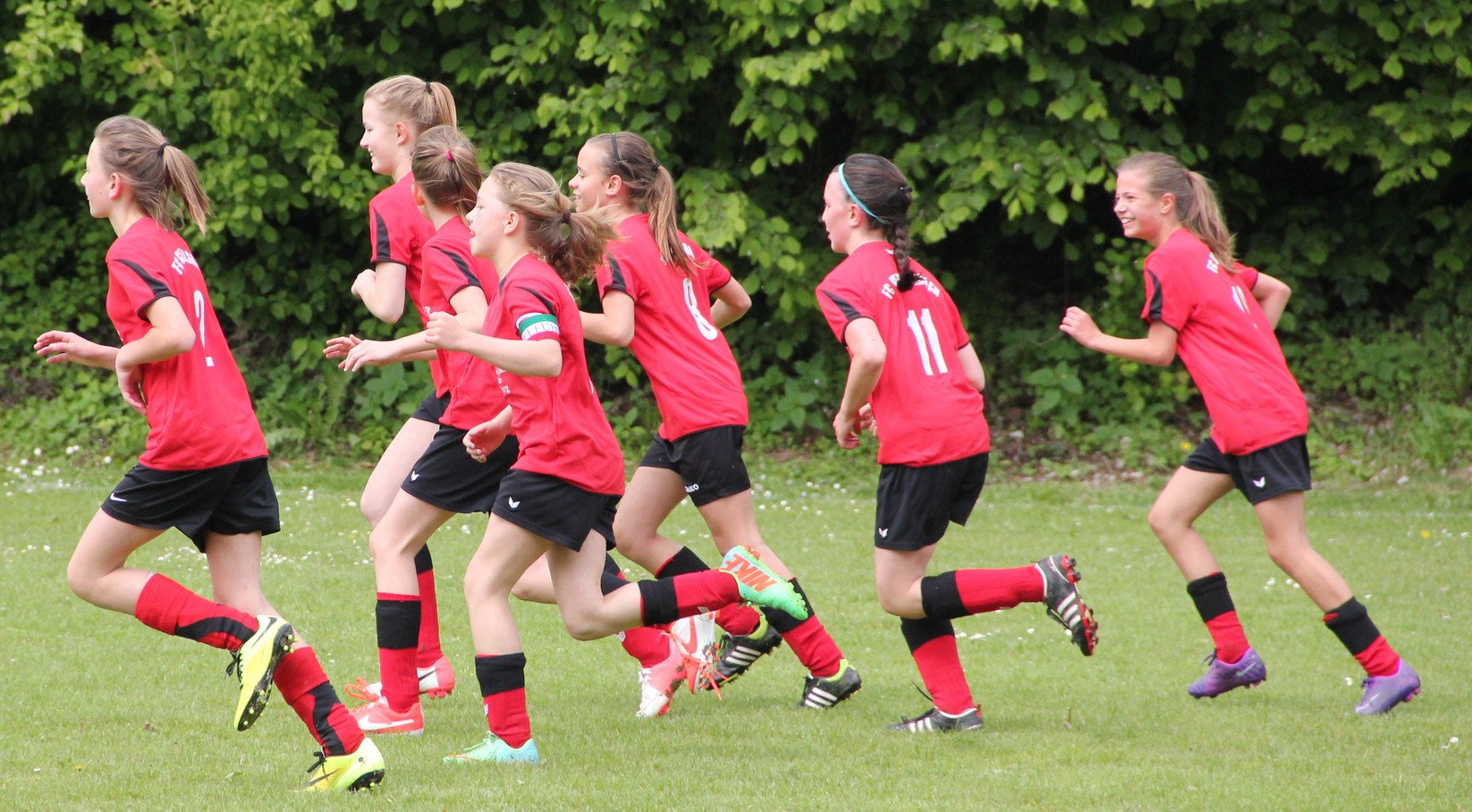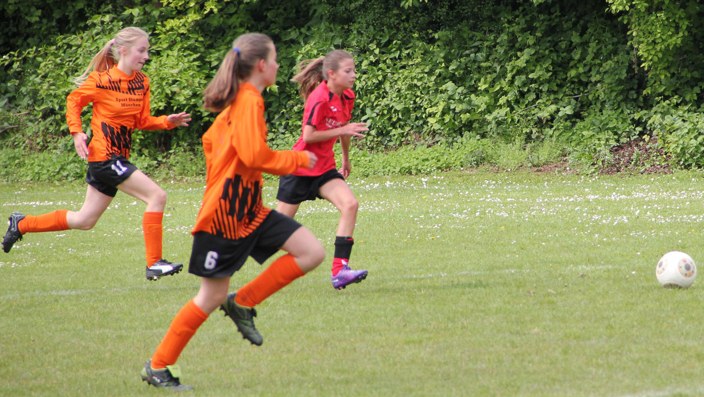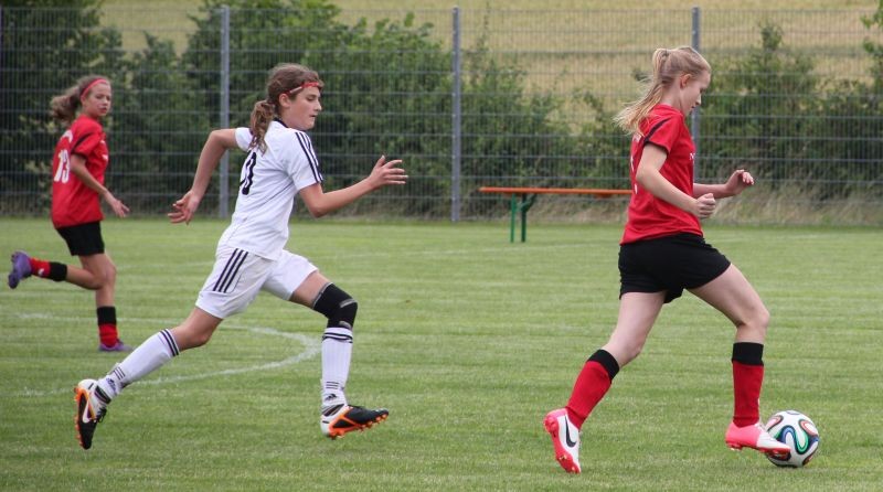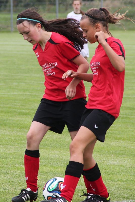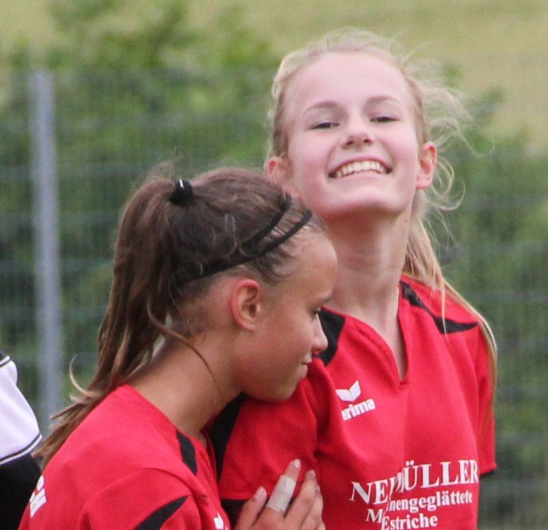 Die Mädchend unserer Spielgemeinschaft spielen in den roten Trikots;