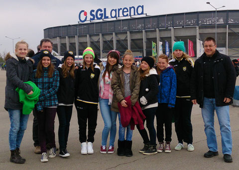 Am Samstag, 19. April 2014 durften 9 Mädchen der D-Juniorinnen sowie Trainer/Betreuer auf Einladung des FC-Augsburg den Besuch des Bundesliga-Spiels gegen Hertha BSC erleben. Leider gab es im Spiel nur ein 0:0, dennoch hatten die Teilnehmer viel Spaß bei diesem Event im Stadion mit allem drum herum. Grund für die Einladung war ein ursprünglich vereinbartes, dann aber ausgefallenes Freundschaftsspiel, bei dem die FC Augsburg D-Juniorinnen nicht antraten, weil sie irgendwie den falschen Spieltag festgehalten hatten. Somit wurden uns für die umsonst angefallene Hin- und Rückfahrt Freikarten zugesandt. Schöne Geste des FCA :)