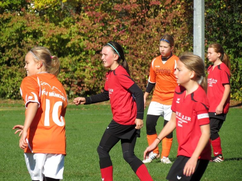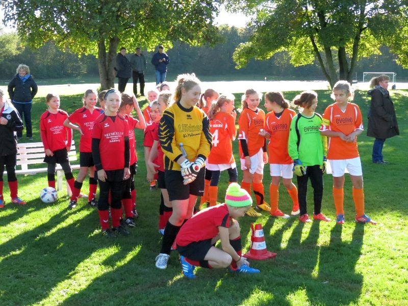 Zum ersten Punktspiel mussten wir nach Vierkirchen anreisen. Natürlich war die Anspannung groß und alle wollten bei der Premiere ihr Bestes geben. So verlief die erste Halbzeit anfangs etwas hektisch. Wir begannen sehr druckvoll und spielten uns schöne Chancen heraus, doch die Rudelbildung der Vierkirchener Mannschaft machte es uns schwer, durch das Mittelfeld zu spielen. So mussten wir immer wieder über die Flügel ausweichen und unser Spiel machen. In der 15 Min. war es dann soweit: Teresa zog in die Mitte und schoss aufs Tor, der Ball prallte aus der Abwehr vor Lucia´s Füße und sie konnte zum 1:0 einschieben. Nach diesem Befreiungsschlag war es eigentlich bis auf zwei Vorstösse des Gegners, die unsere Abwehr souverän klärte, ein Spiel auf das Tor des Gegners, in dessen Hälfte wir uns festbissen.