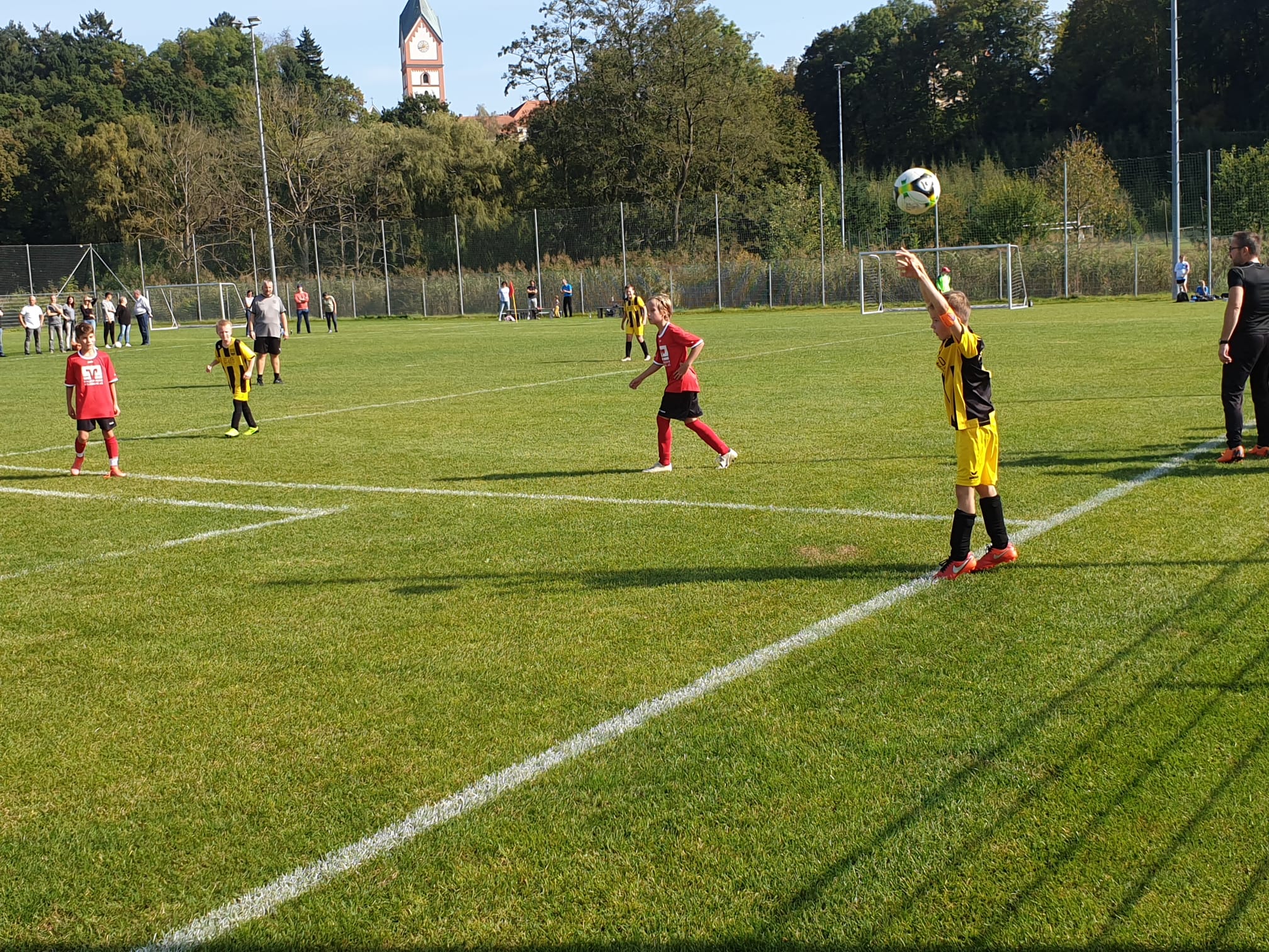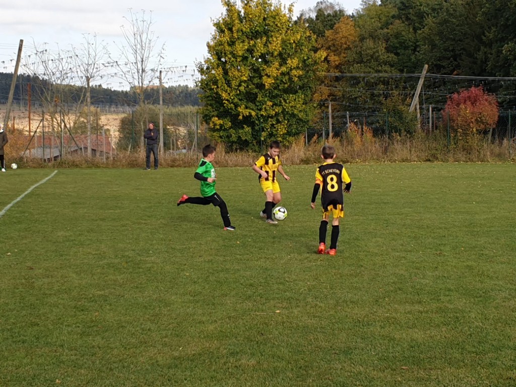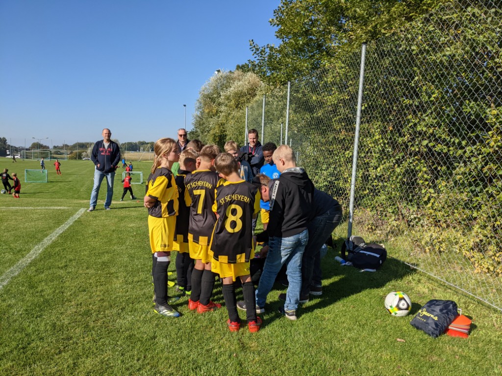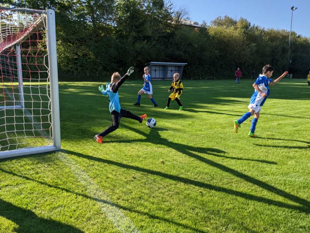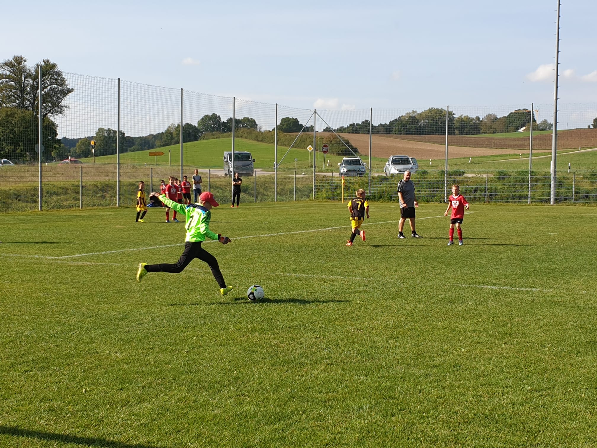 Wie all unsere Spiele begann auch dieses rasant und Vincent verhinderte bereits Sekunden nach dem Anpfiff mit einer Rettungstat das 0:1. Kurze Zeit später erkämpfte sich Pauli den Ball und legte ein wunderbares Solo hin, welches mit einem super Pass auf Julius endete, der die Chance ergriff und die Scheyerer in Führung brachte (3.’). Bereits in der 8. Minute erhöhte David nach einem Traumpass von Julius auf 2:0, spitze Jungs! Die 20. Minute erzeugte ein leichtes Schmunzeln bei Trainern und Zuschauern, da Pauli einen scheinbar geklärten Ball aus dem Strafraum schießen wollte, dabei aber seinen Mitspieler am Rücken traf und somit ein doch etwas kurioses Eigentor verschuldete. Na, das muss man auch erstmal so hinbekommen :-). Halbzeitstand 2:1
